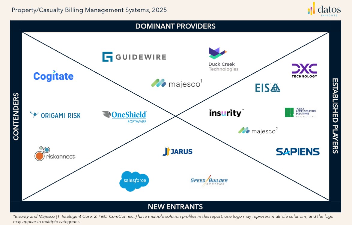 This report provides an overview of the current vendor marketplace for stand-alone P/C billing systems. It is based on responses to a request for information and demos when available. This report profiles solutions from the following vendors: Cogitate, Duck Creek Technologies LLC, DXC Technology, EIS, Guidewire, Insurity, Jarus Technologies, Majesco, OneShield, Policy Administration Solutions Inc., Riskonnect, Salesforce, Sapiens International, and SpeedBuilder Systems Inc.